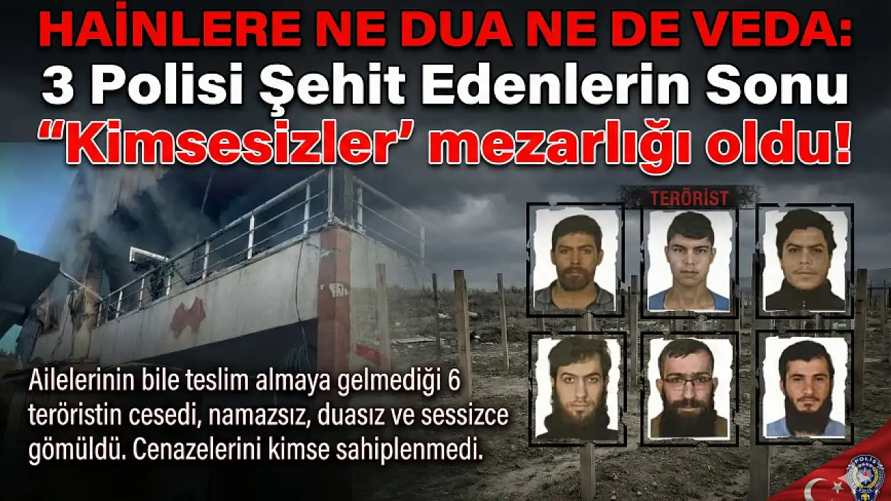 Geniş güvenlik önlemleri altında gerçekleşen defin işleminde; ne saf tutacak bir cemaat vardı, ne helallik isteyen bir ses, ne de kılınacak bir cenaze namazı. 3 polisin katilleri, mezar başında bir Fatiha bile okunmadan, açılan çukurlara sessiz ve kontrollü bir şekilde gömüldü.