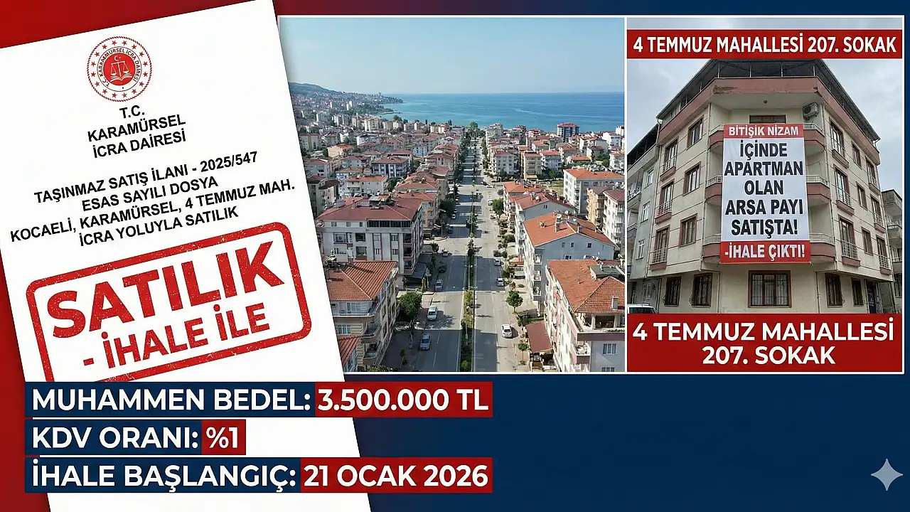 Karamürsel İcra Dairesi tarafından yürütülen 2025/547 Esas sayılı dosya kapsamında, ilçenin merkezi konumlarından biri olan 4 Temmuz Mahallesi'nde yer alan konut alanı vasıflı taşınmaz, yeni sahibini bekliyor. "İçinde apartman olan arsa" niteliğiyle dikkat çeken satışta, KDV oranının %1 olması ise alıcılar için büyük bir avantaj oluşturuyor.