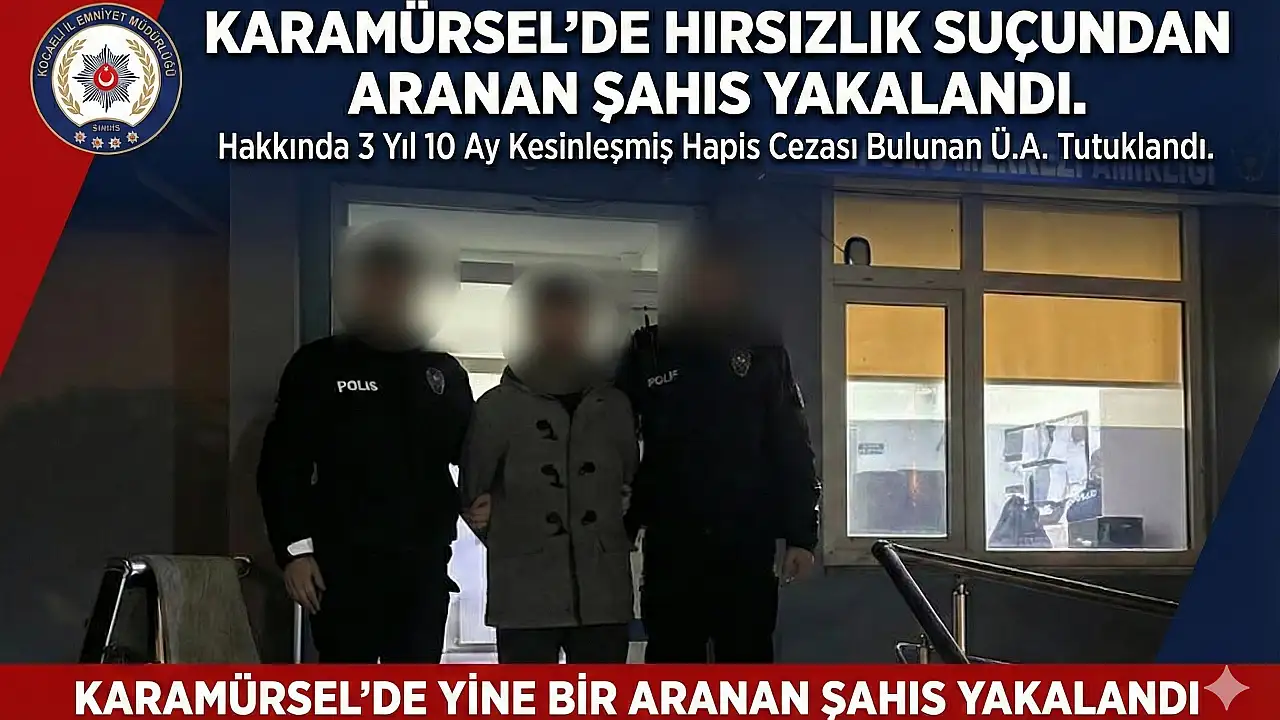 Kocaeli İl Emniyet Müdürlüğü, suçun önlenmesi ve faillerin yakalanmasına yönelik çalışmalarına hız kesmeden devam ediyor. Bu kapsamda Karamürsel'de gerçekleştirilen son operasyonda, "Hırsızlık" suçundan aranan Ü.A. isimli şahıs polis ekiplerinin takibi sonucu yakalandı.