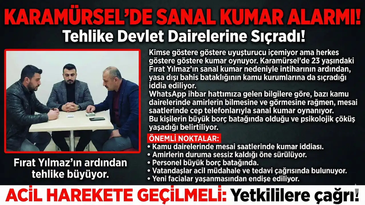 Karamürsel’de genç yaşta bir canı hayattan koparan sanal kumar illeti, şimdi de kamu kurumlarını tehdit ediyor. Vatandaşlar, "Kimse göstere göstere uyuşturucu içemiyor ama herkes göstere göstere kumar oynuyor" diyerek tehlikenin boyutuna dikkat çekerken, resmi dairelerde ceptelefonu ile uzun bir zamandır göstere, göstere sanal kumar oynandığı iddia edildi.