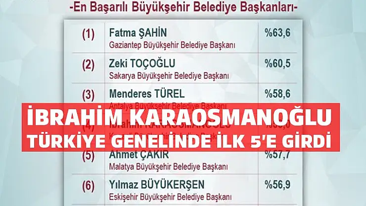 Listenin ikinci sırasında 60,5 ile Sakarya Büyükşehir Belediye Başkanı Zeki Toçoğlu, üçüncü sırada ise yüzde 58,6 ile Antalya Büyükşehir Belediye Başkanı Menderes Türel ve dördüncü sırada ise 58 ile Kocaeli Büyükşehir Belediye Başkanı İbrahim Karaosmanoğlu yer aldı.