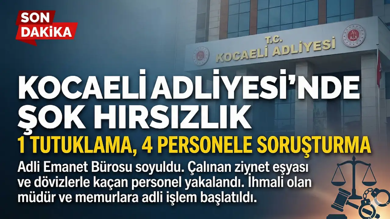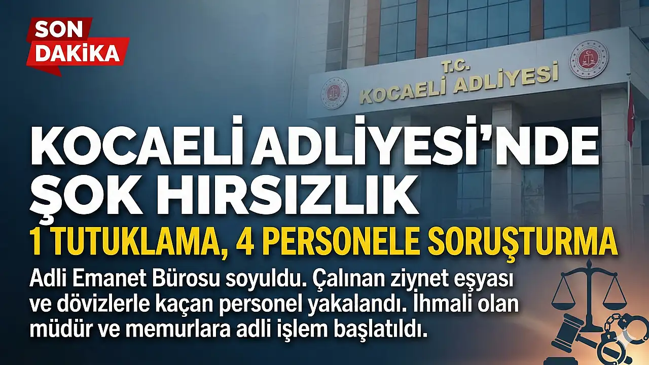 Kocaeli Adliyesi Adli Emanet Bürosu'nda meydana gelen hırsızlık olayında, emanet deposundaki ziynet eşyaları ve dövizleri çaldığı tespit edilen personel tutuklandı. Olayın ardından ihmali bulunduğu değerlendirilen 4 adliye personeli hakkında adli ve idari soruşturma başlatılırken, bir memur görevden uzaklaştırıldı.