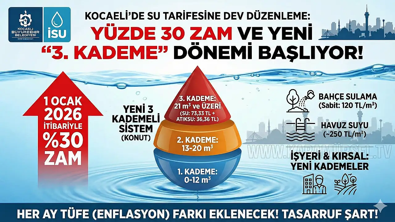 Kocaeli Büyükşehir Belediyesi İSU Genel Müdürlüğü’nün yarın gerçekleştirilecek genel kurulunda su tarifeleri sil baştan değişiyor. 1 Ocak 2026’dan itibaren geçerli olacak düzenlemeyle konutlara yüzde 30 zam yapılırken, çok su tüketenler için "3. Kademe" tarifesi devreye giriyor.