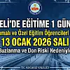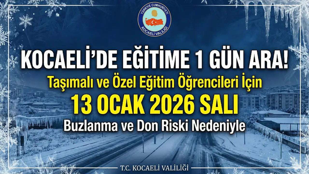 "Yapılan son meteorolojik değerlendirmelere göre; Kocaeli il genelinde özellikle yüksek kesimlerde 13.01.2026 Salı sabah saatlerinde buzlanma ve don olayı görülebileceğinden herhangi bir olumsuzluk yaşanmaması için ilimiz genelinde taşımalı eğitime (özel eğitim dahil) 1 (bir) gün süre ile ara verilmiştir."