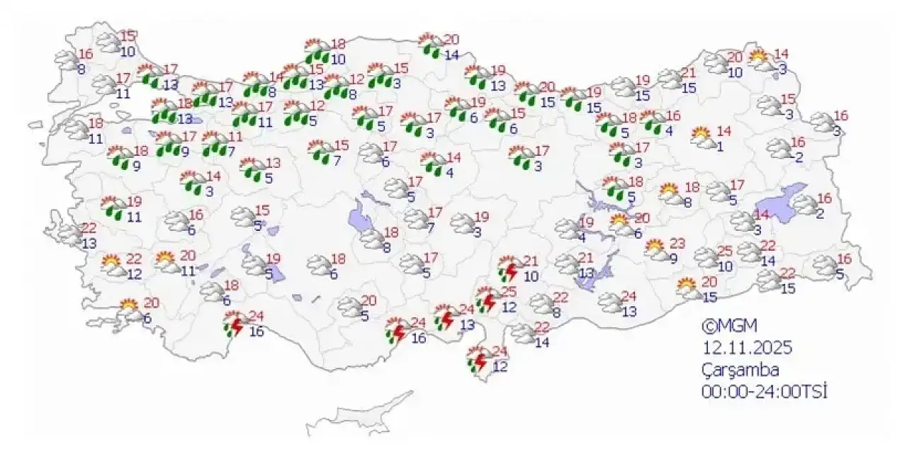 12 Kasım Çarşamba: Sağanak yağışlı