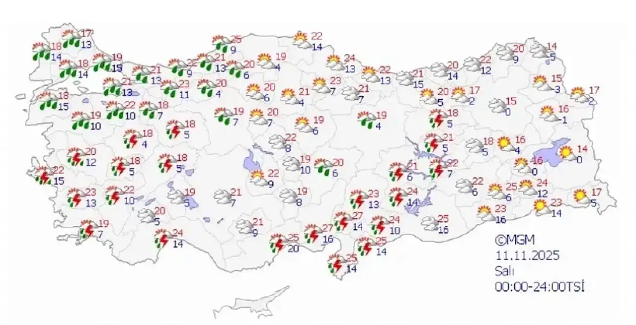 11 Kasım Salı: Sağanak yağışlı