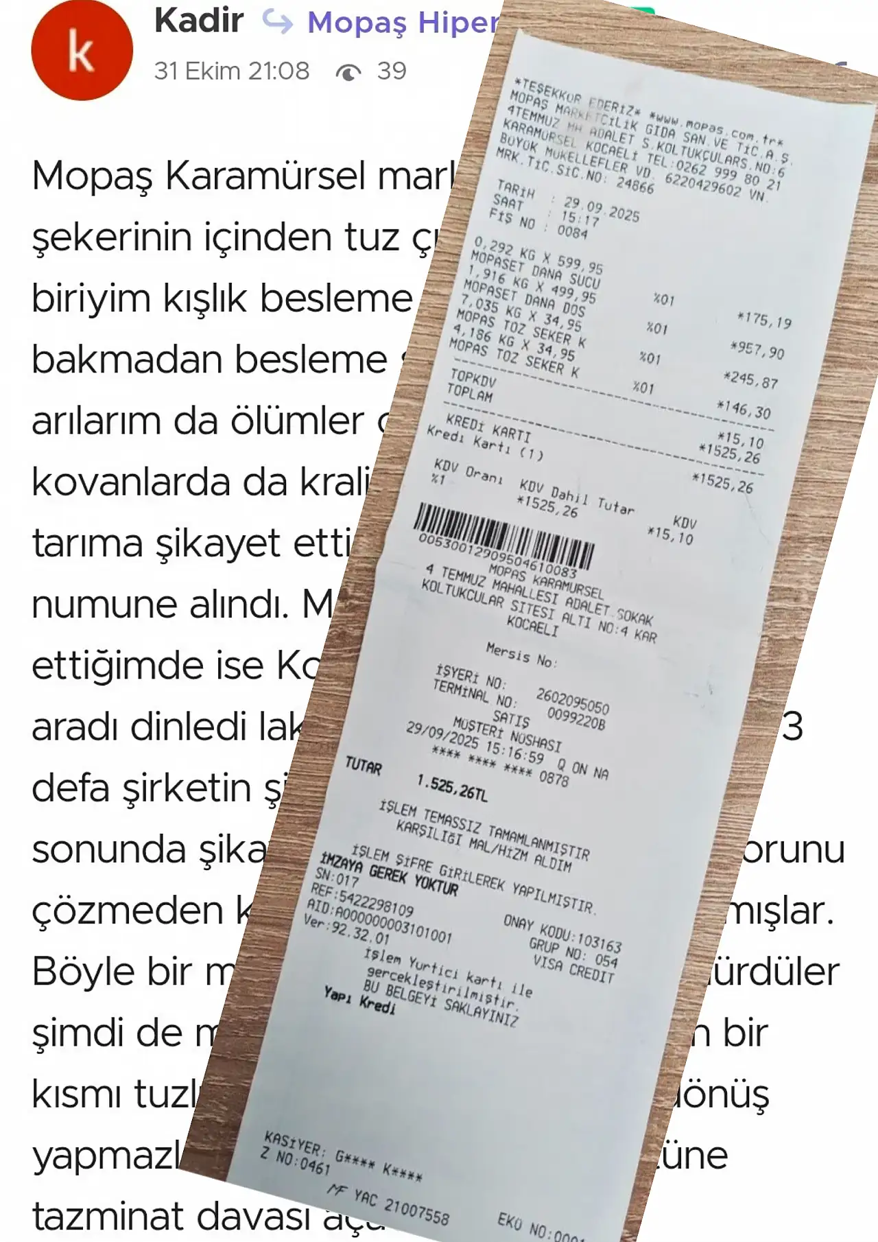KOCAELİ / KARAMÜRSEL – Karamürsel’de ikamet eden ve arıcılıkla uğraşan bir vatandaş, Mopaş marketten satın aldığı toz şekerinin hatalı ürün olması nedeniyle büyük bir mağduriyet yaşadığını belirtti.